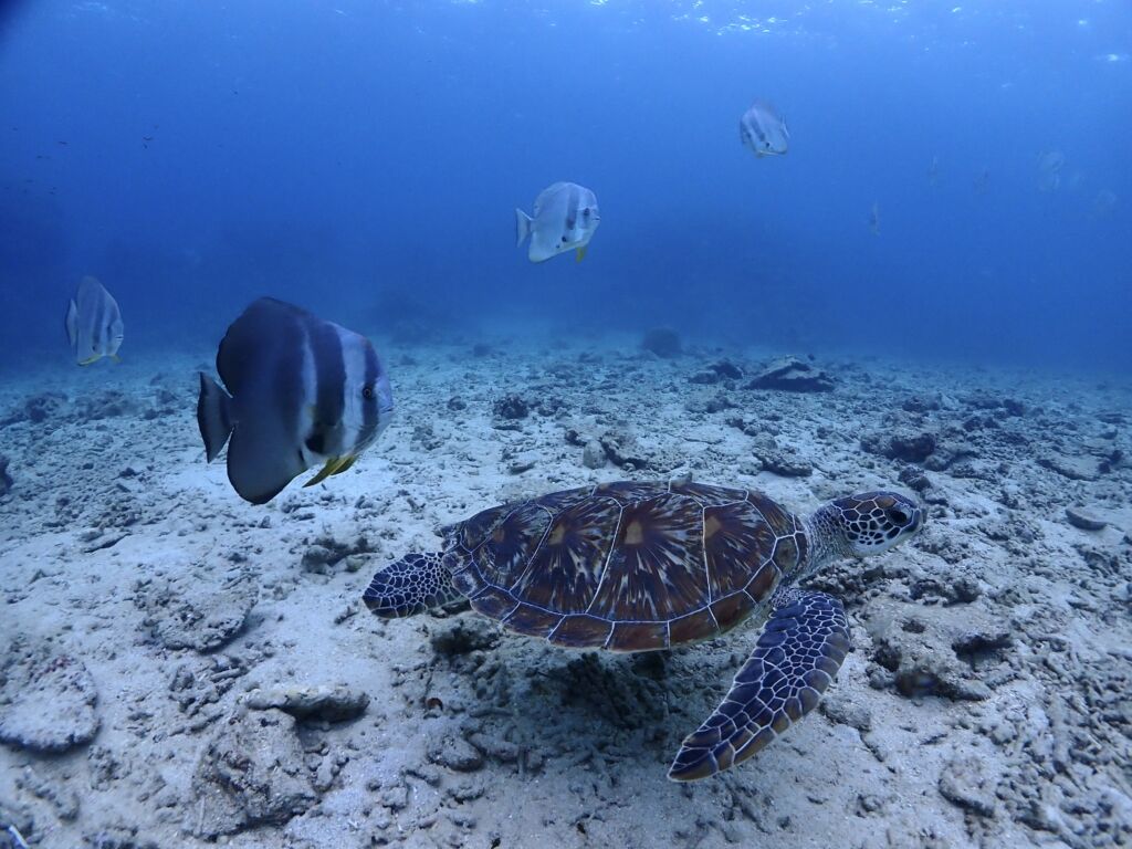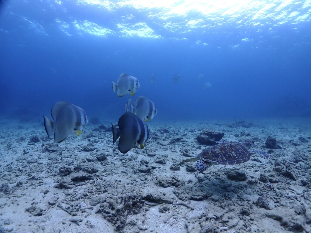 カメ🐢さんがツバメウオを引き連れてお散歩中でした😁