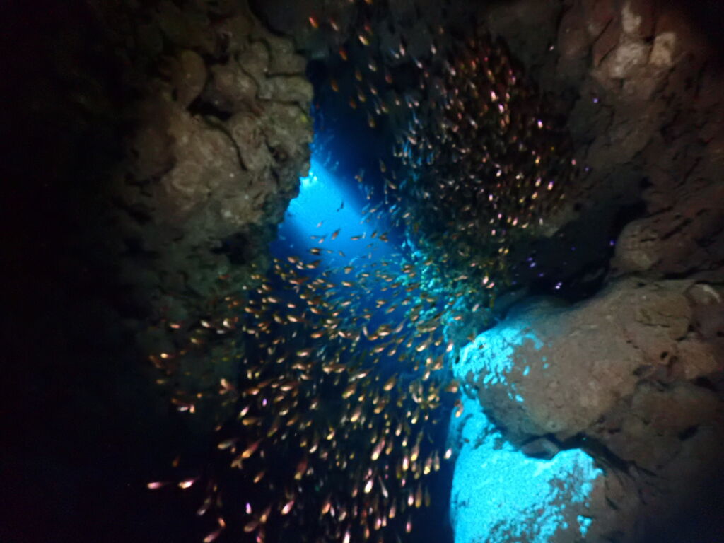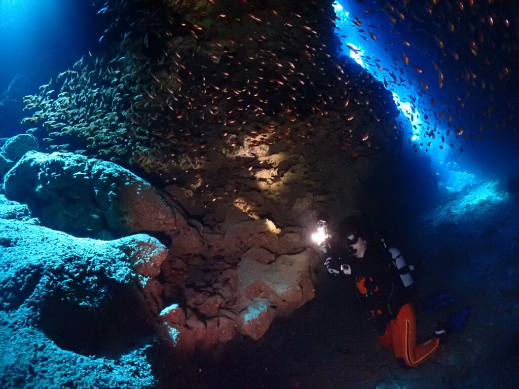 ケーブの中のテンジクダイやキンメ達はピークの時からすると数は減ってしまいましたがそれでも見応え抜群🤩