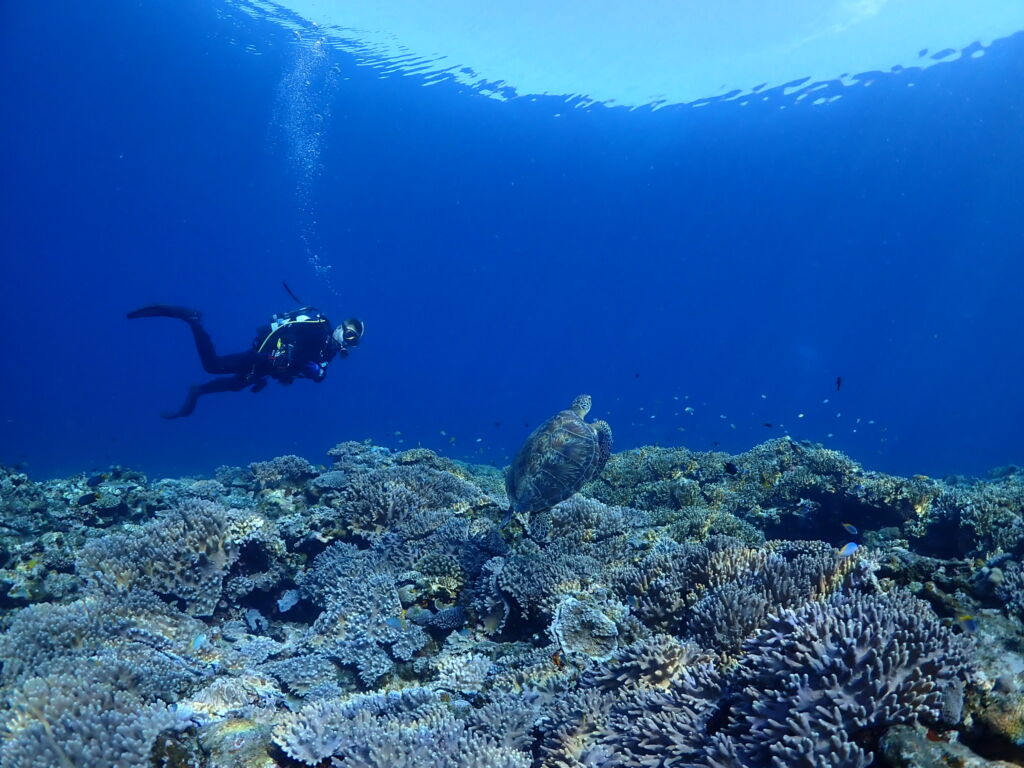 珊瑚の群生エリアでは亀さんがのんびりと休憩☕😌💕