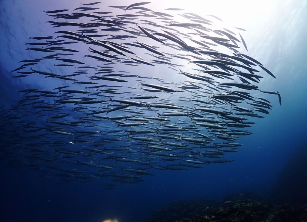カマス、サバヒー、カスミアジ、カツオ、ツムブリ、ナポレオンがまとまって目の前をウロウロして感動でした、マンタよりもレアなはず(笑)