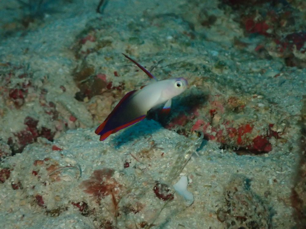 テンジクダイを食べようと身を乗り出すハナヒゲウツボ幼魚♩