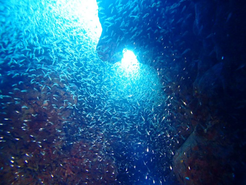 穴の中にはウスモモテンジクダイが岩壁びっしり!!ライトで照らすとキラキラして美しかったです♪